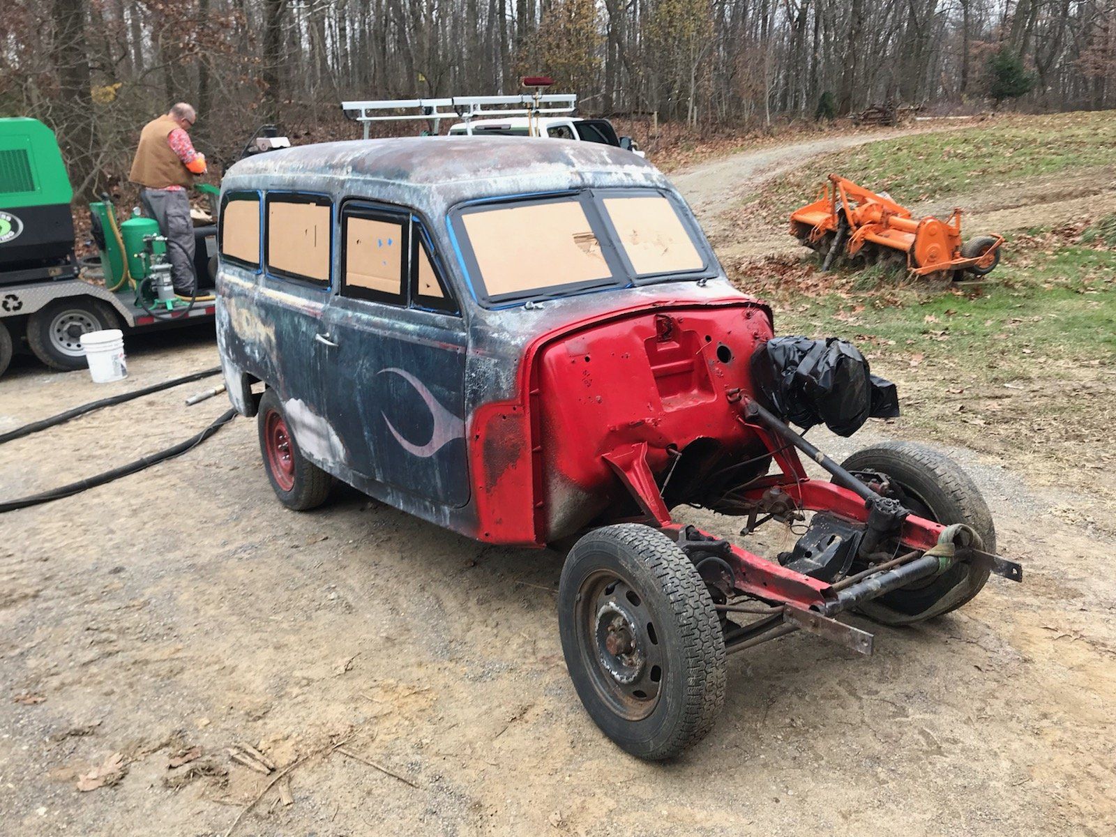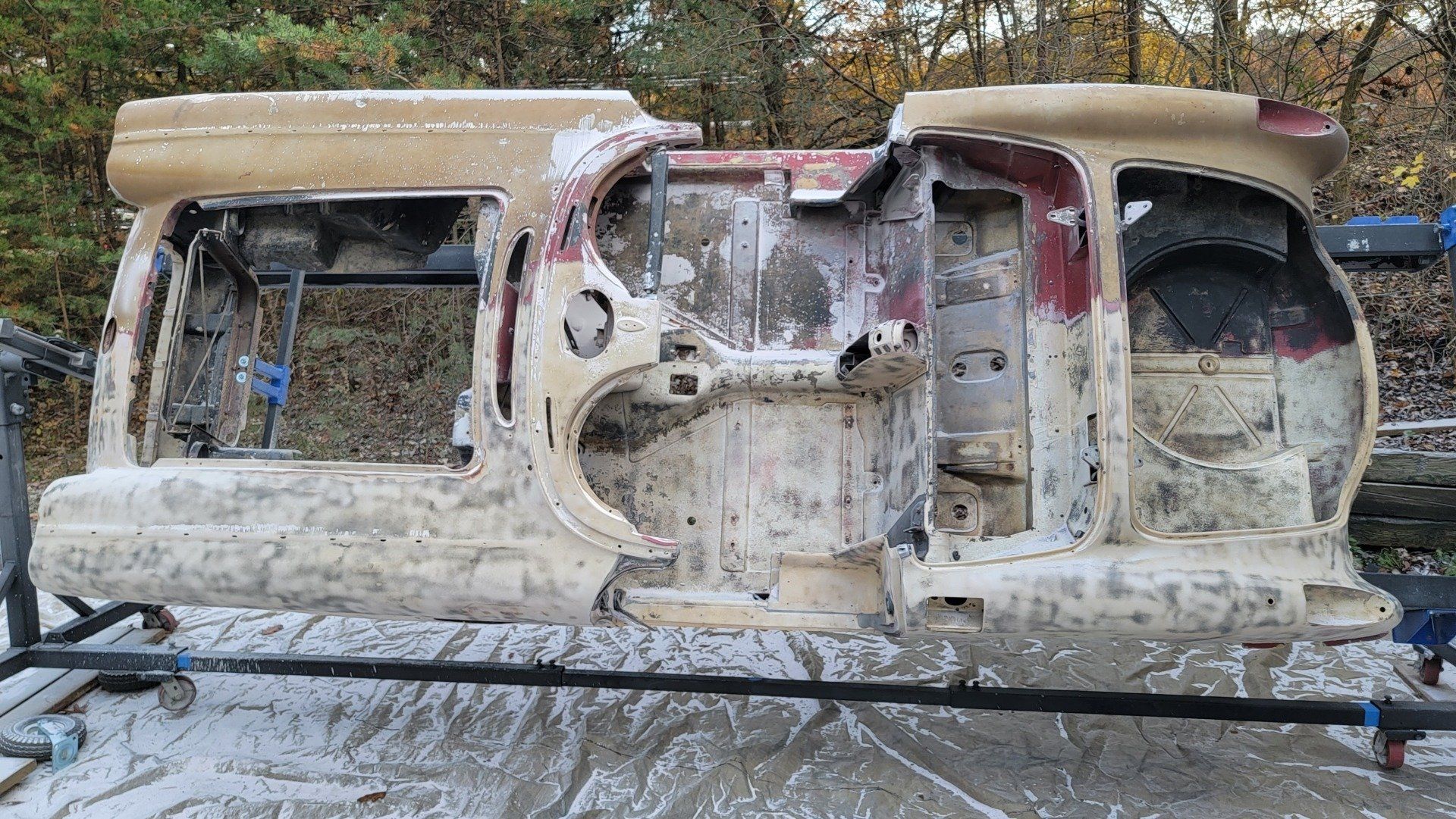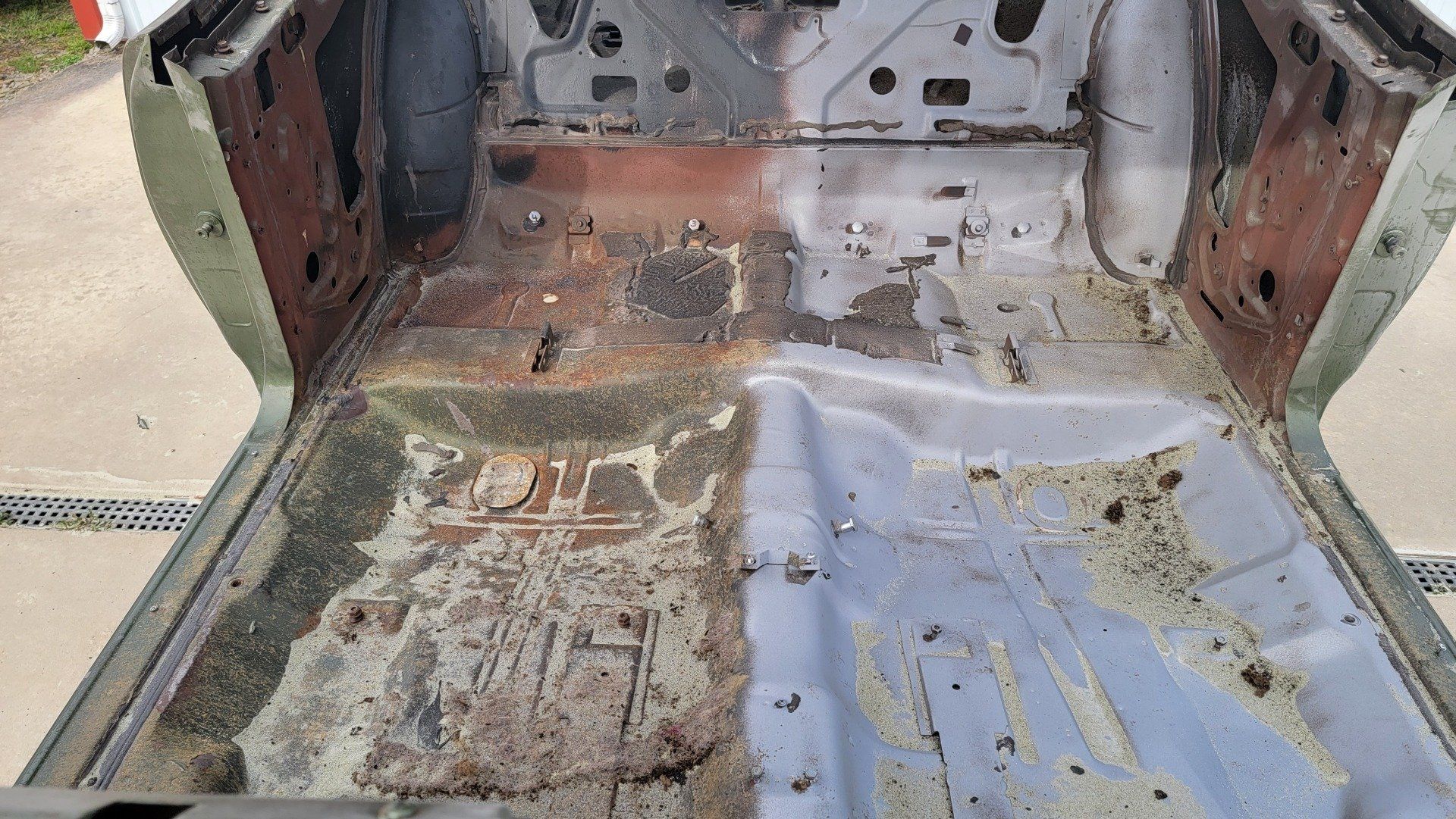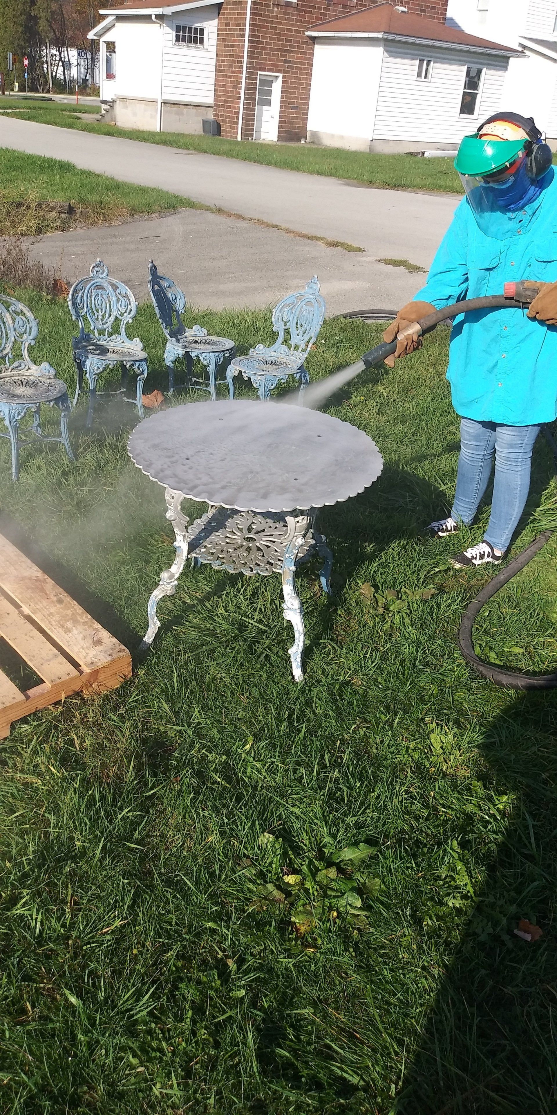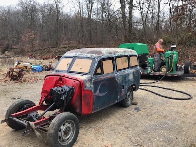 This group has pictures of a very cool old gas pump, circa 1920s and 1930s. The before shows the red paint and rust; the after shows perfectly clean metal ready to prime and paint. Also, the pictures of the wheels are the before and after of